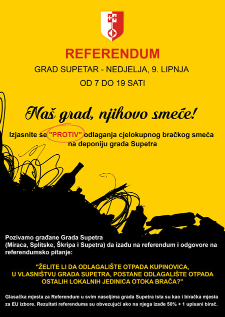 Lokalni referendum održat će se u nedjelju, 9. lipnja 2019. godine a građane pozivamo da mu se odazovu i na referendumskom listiću na pitanje: »Želite li da odlagalište otpada Kupinovica u vlasništvu grada Supetra, postane odlagalište otpada ostalih lokalnih jedinica otoka Brača?« zaokruže "PROTIV".