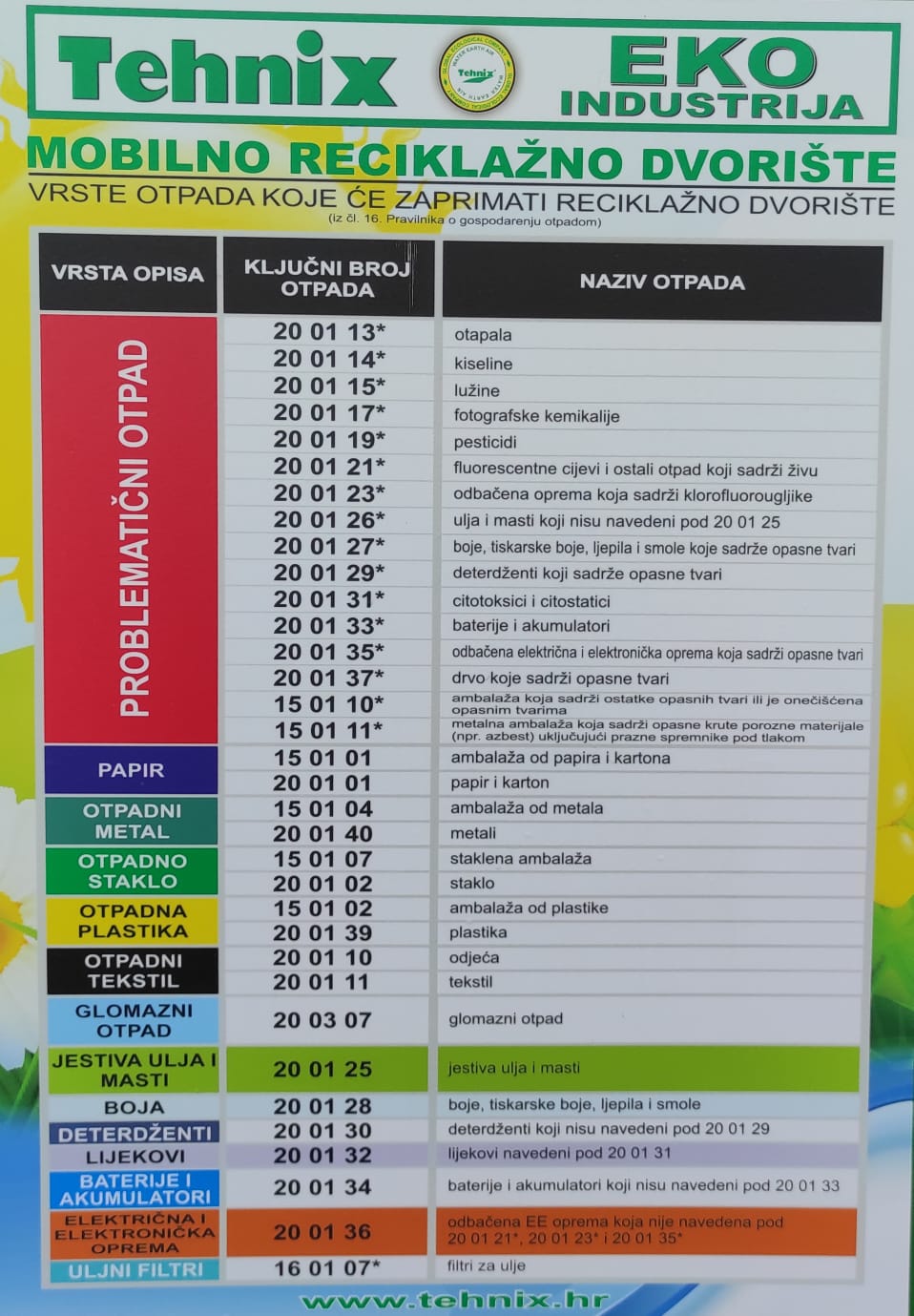 Vrste otpada koje će se zaprimati u mobilnom reciklažnom dvorištu naznačene su u priloženom dokumentu. Radno vrijeme mobilnog reciklažnog dvorišta je svaki utorak od 08 do 12 sati.