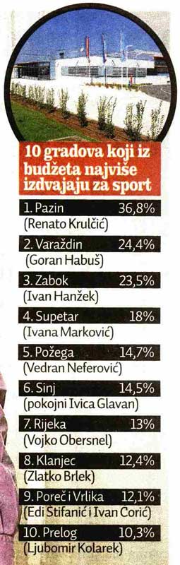 Ispred Grada Supetra su Pazin (36,8%),Varaždin (24,4%) te Zabok (23,5%) a iza njega Požega (14,7%), Sinj (14,5%), Rijeka (13%), Klanjec (12,4%), Poreč i Vrlika (12,1%) te na desetom mjestu Prelog sa 10,3% proračuna uloženog u sport i rekreaciju.