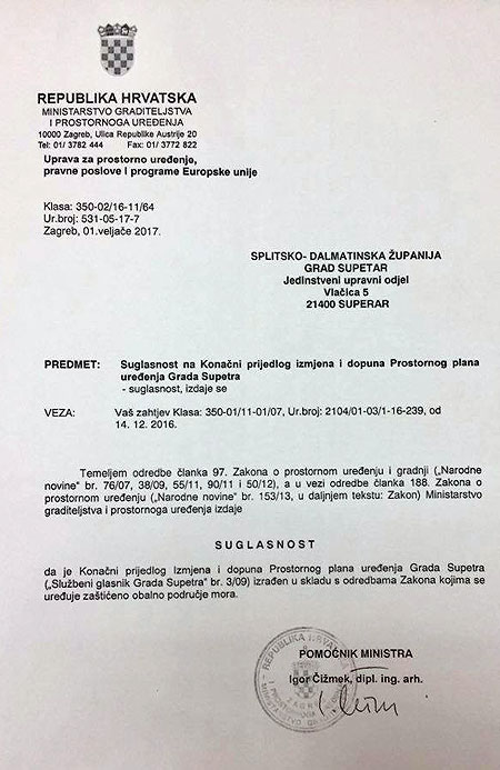 Nakon 3 godine sustavnog rada na prostornom planu Grada Supetra dobijena je suglasnost na Konačni prijedlog njegovih izmjena i dopuna.